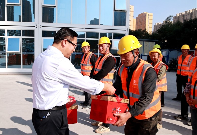 活動中,市總工會領導與一線施工人員進行了親切交談,仔細詢問項目進展和員工生活保障情況,并為大家送來了月餅、豬肉等慰問品。